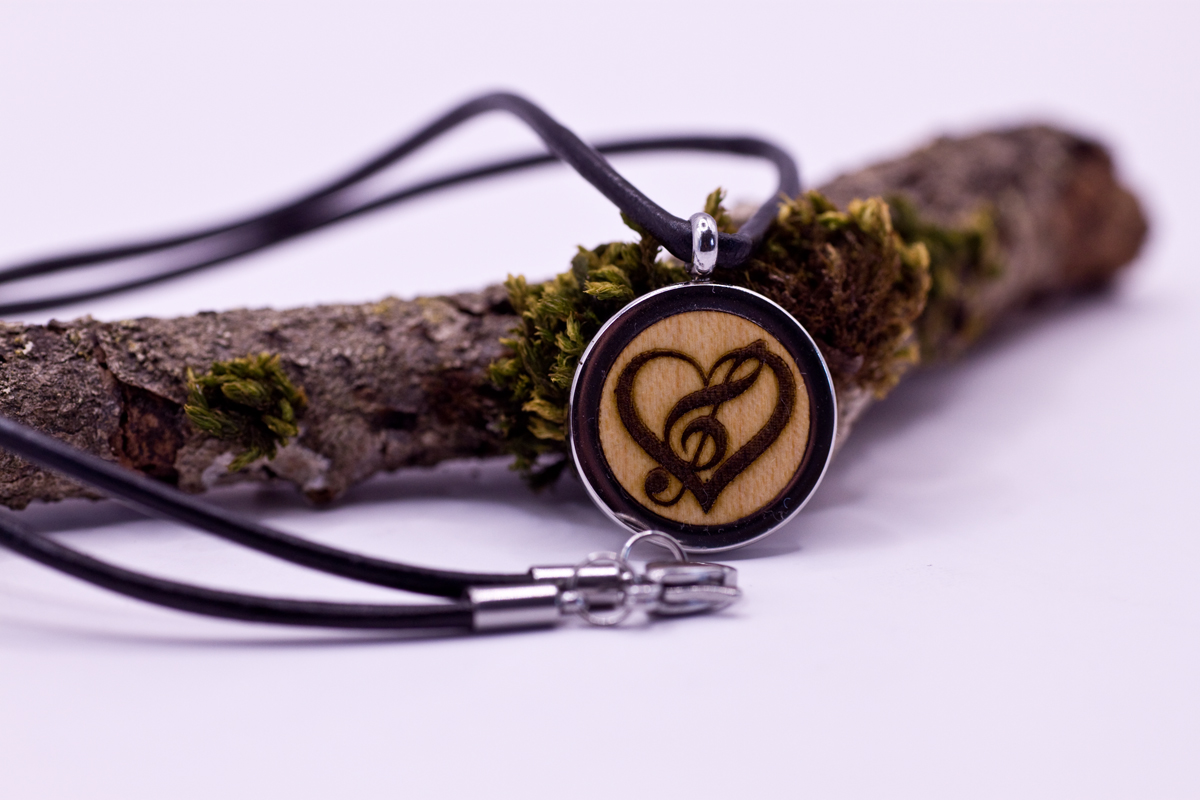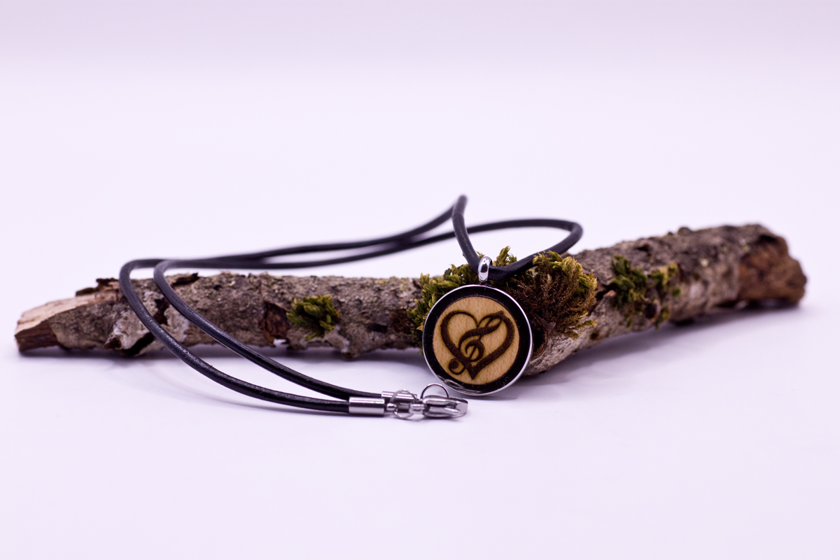 Bestellen Sie noch heute Ihre eigene Halskette mit Medaillon aus Holz und Gravur „Herz mit Notenschlüssel“ und erfahren Sie das Gefühl von stimmigen Klängen um Ihrem Hals.