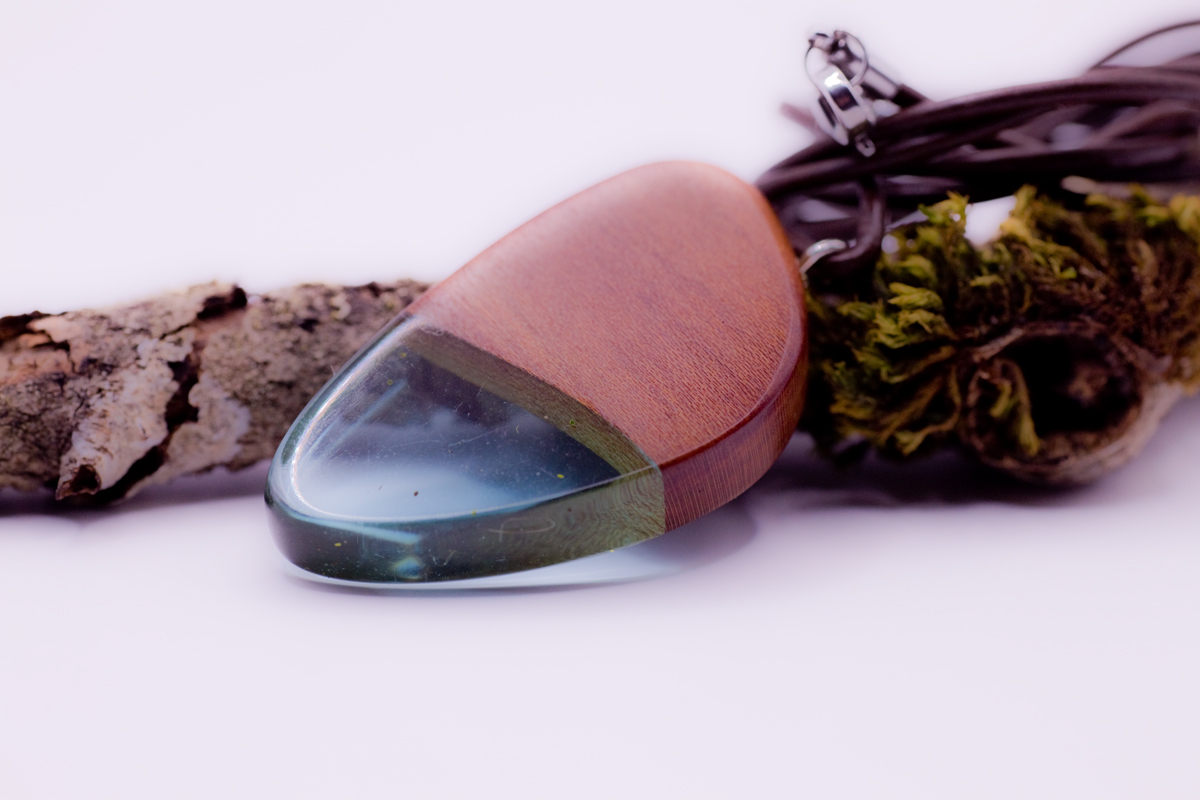 - Pektolit-inspiriertes Design: Die Kombination von Kirschholz und türkisfarbenem Epoxidharz mit goldenem Glitzerstaub verleiht der Halskette das Aussehen eines seltenen Pektolit-Edelsteins.