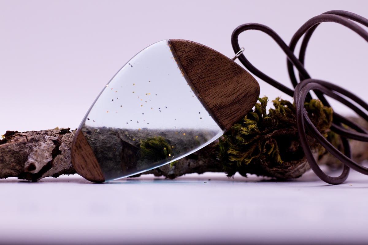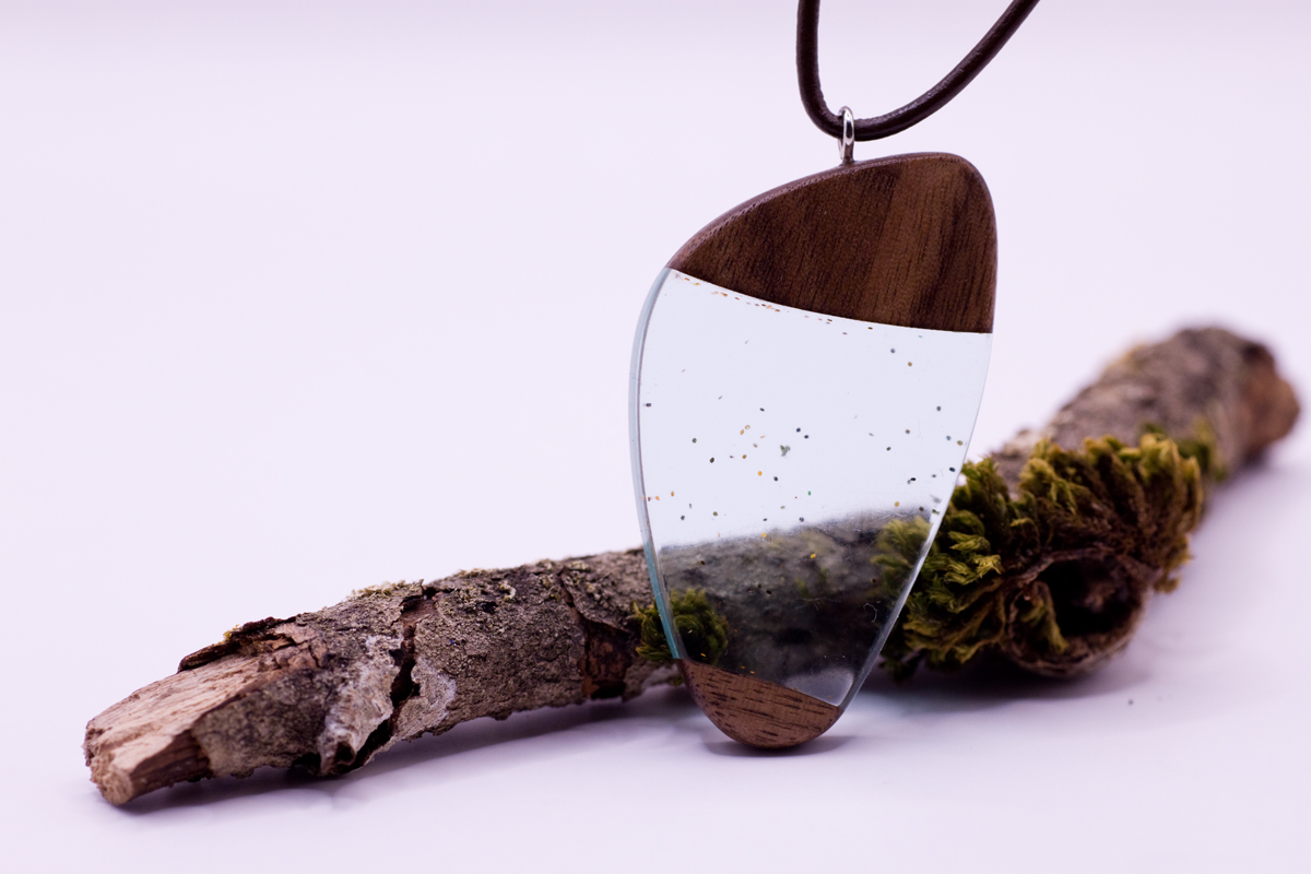 Erschaffe dein persönliches Märchen: Unsere Walnussholz & Topas-Edelstein-inspirierte Halskette mit türkisfarbenem Epoxidharz und goldenem Glitzerstaub!