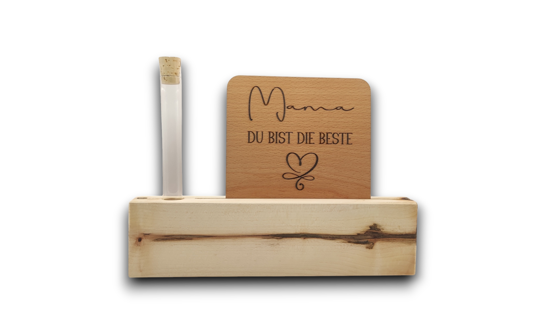 Kartenhalter aus Ahorn und Reagenzglas mit Korken