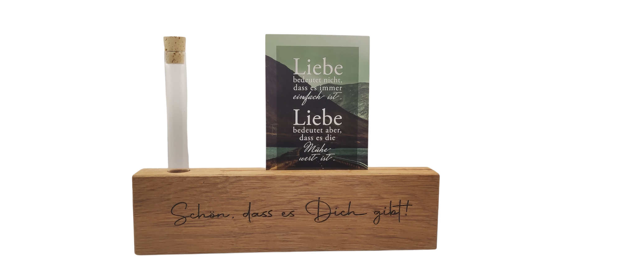 Entdecke den Charme des Natürlichen mit unserem Holzkartenhalter „Schön, dass es Dich gibt“ mit Reagenzglas!