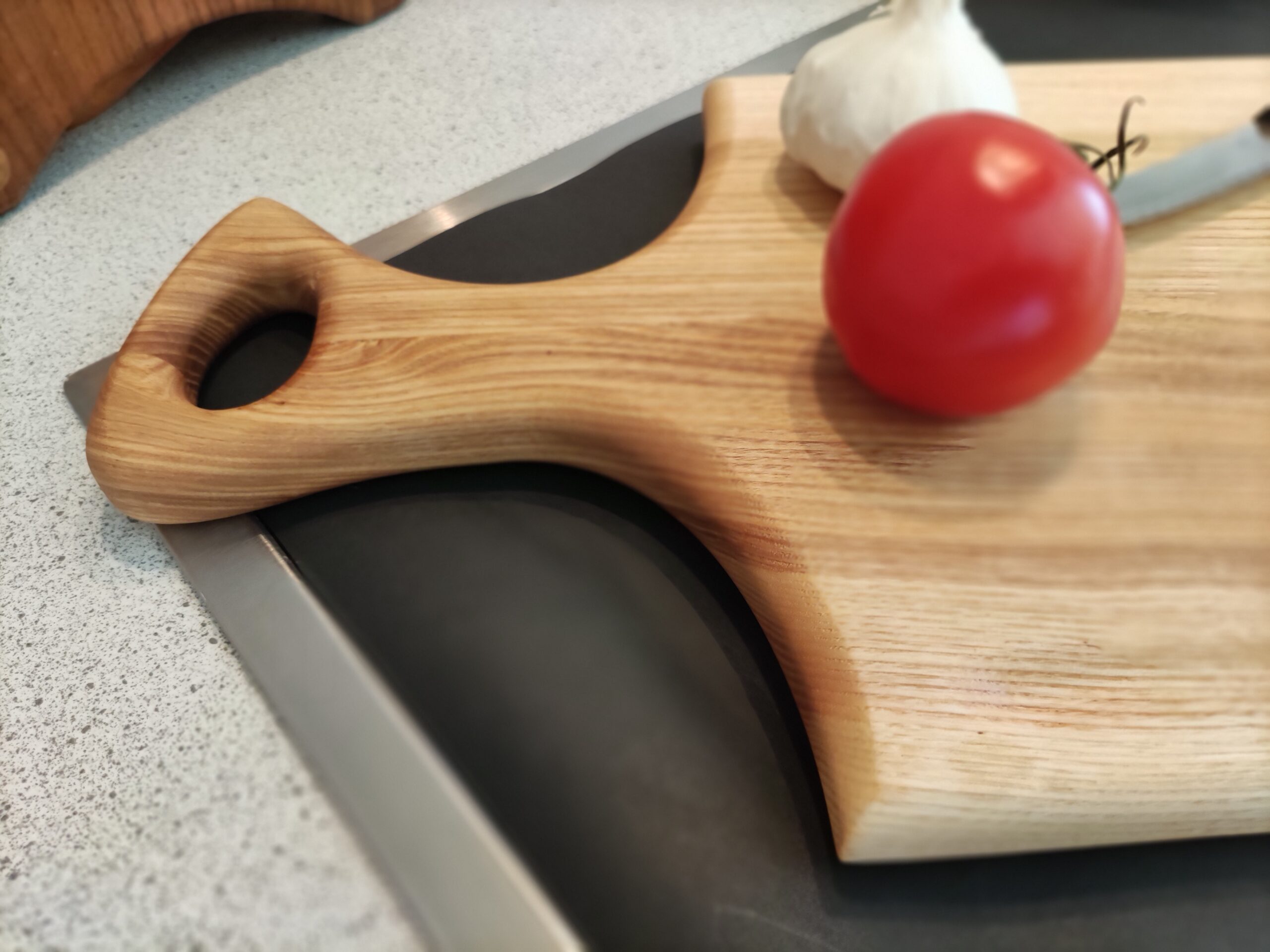 Produktbeschreibung: Schneidebrett aus Massivholz Esche mit Saftrille und geschwungenem Griff