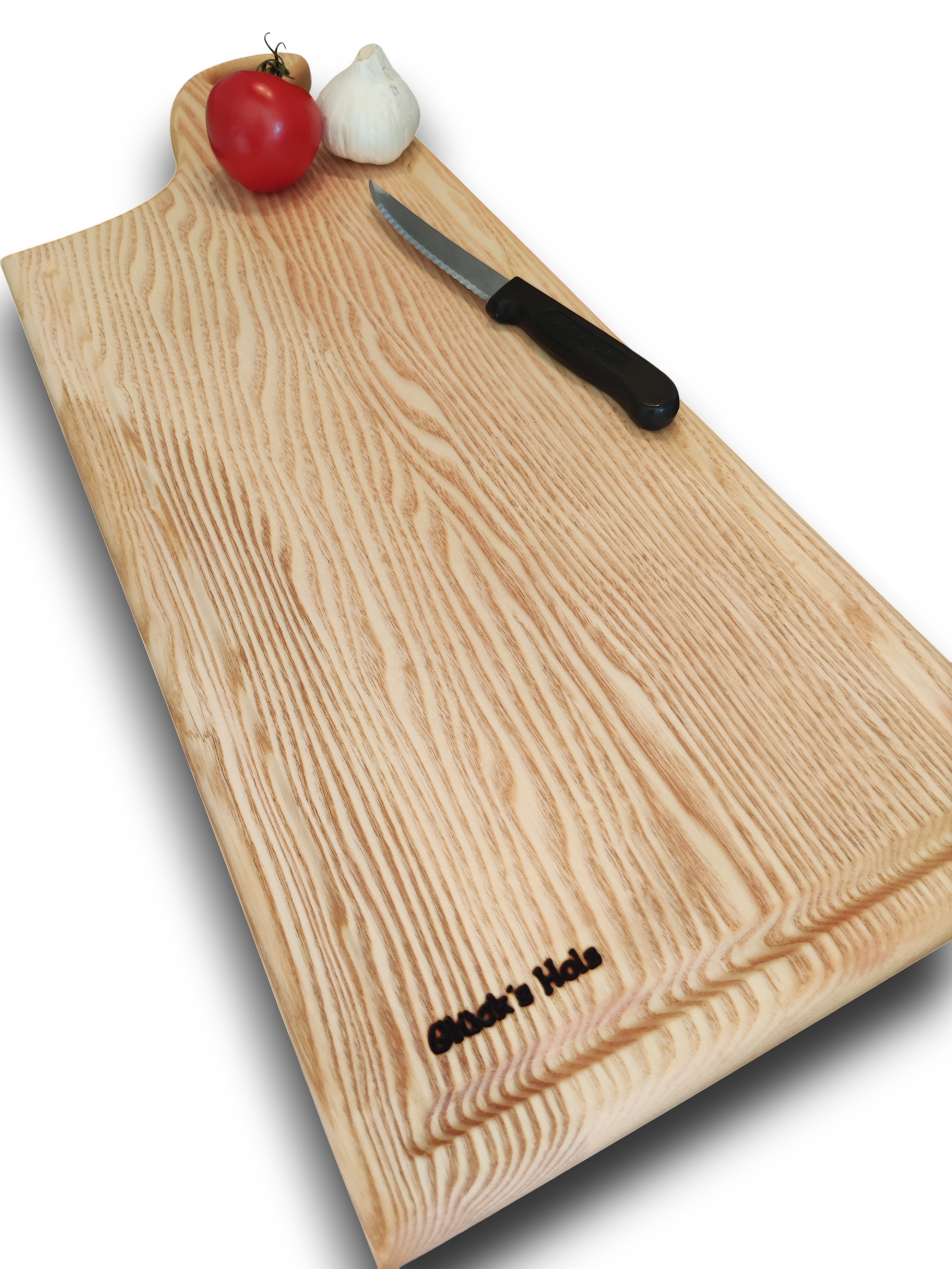 Produktbeschreibung: Schneidebrett aus Massivholz Esche mit Saftrille und geschwungenem Griff