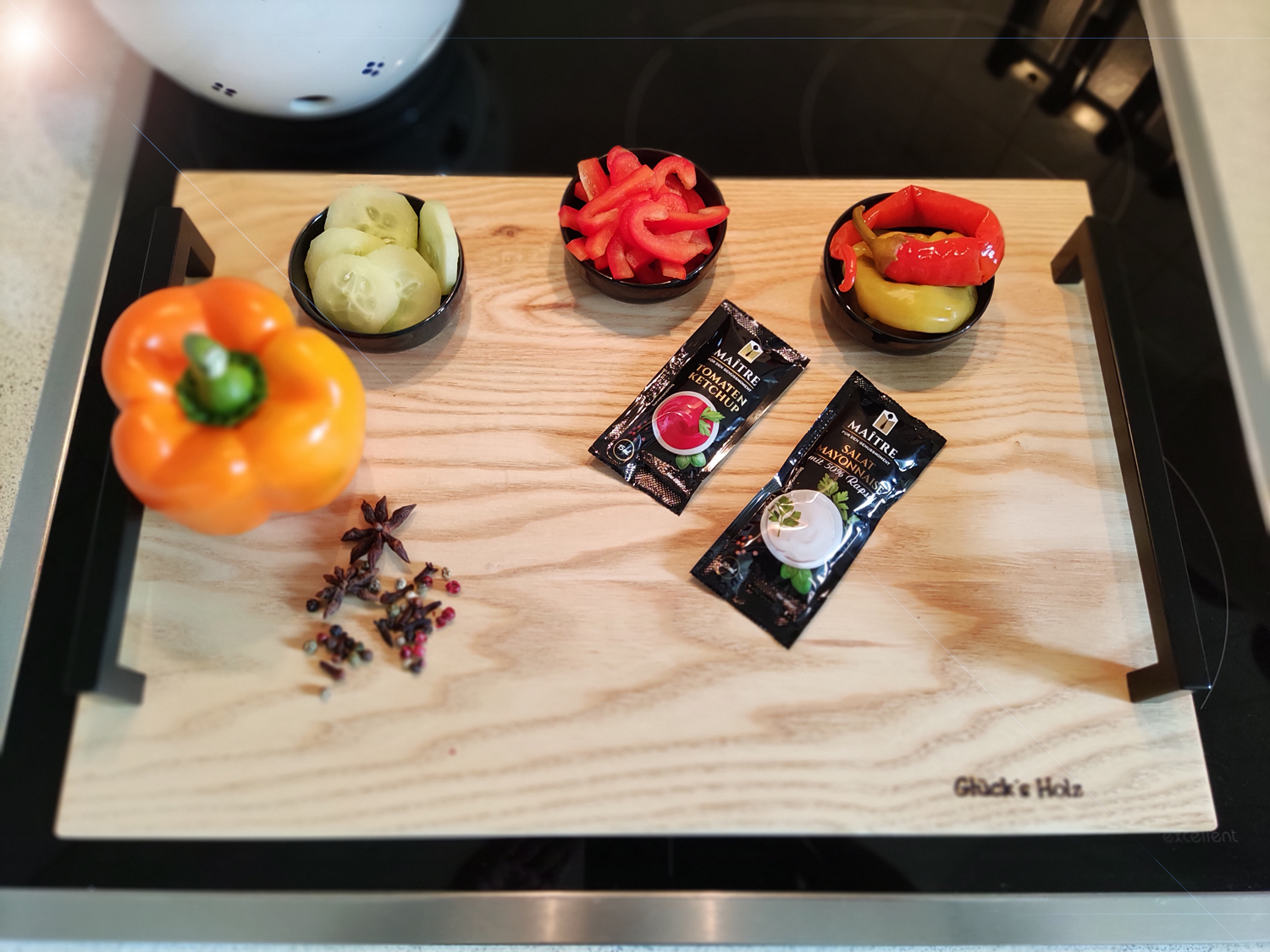Die Lieferung erfolgt ohne Deko-Gegenstände (wie z.B. Obst, Gemüse, Messer, usw. Lieferumfang siehe unten)