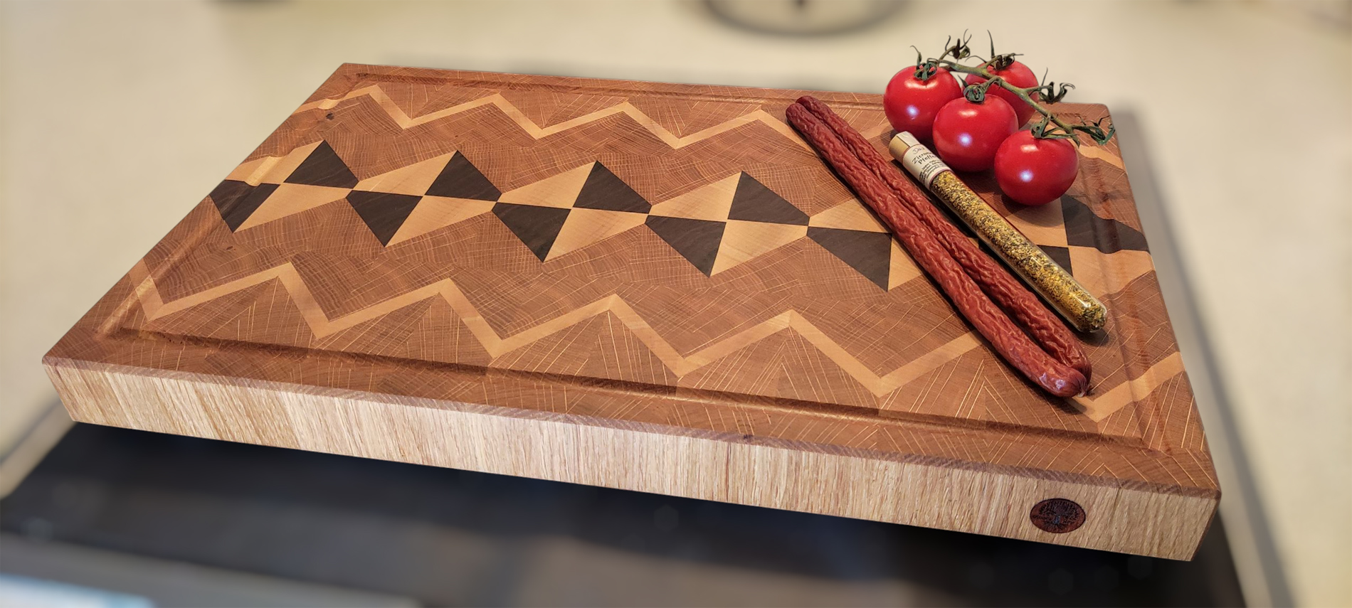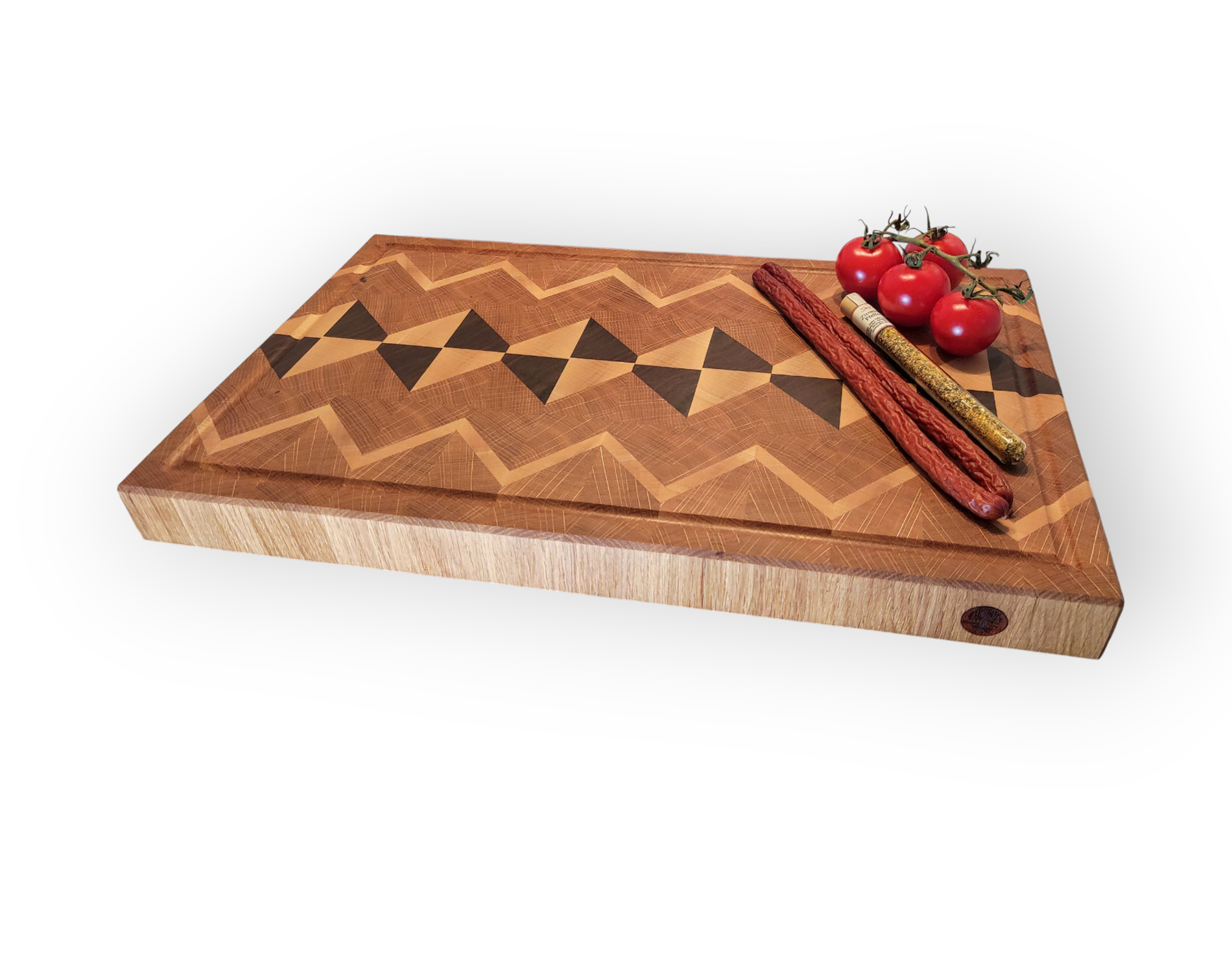 Ein Meisterwerk der Handwerkskunst erwartet Sie mit unserem symmetrischen Diamond-Muster Stirnholz-Schneidebrett. Dieses Kunstwerk aus hochwertigem regionalem Holz – Eiche, Ahorn und Nussbaum – ist nicht nur ein zuverlässiger Begleiter in deiner Küche, sondern auch eine beeindruckende Servierplatte für besondere Anlässe und festliche Zusammenkünfte.