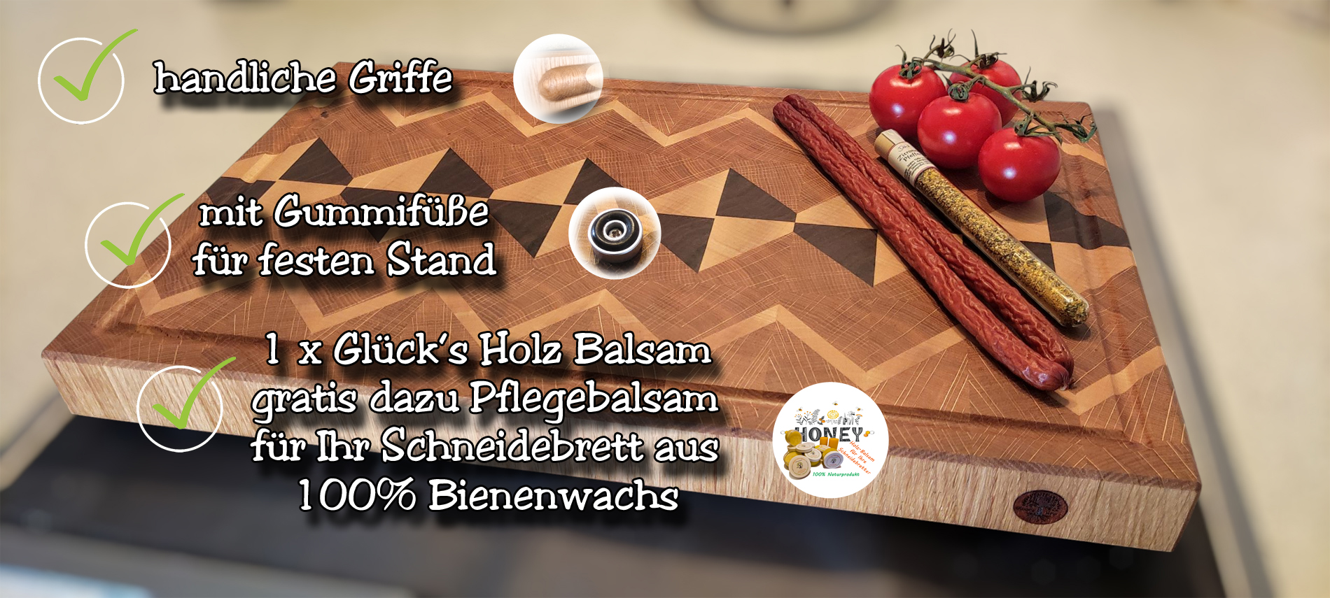 TIPP: Fragen Sie am besten bei Glück’s Holz nach dem Glück’s-Holz Balsam – das Pflegemittel für Schneidebretter aus eigener Herstellung. 100% BIO-Naturprodukt aus reinem Bienenwachs aus der Imkerei Gittinger und BIO-Kokosöl. Das Glück’s Holz Team kann Ihnen ein Pflegebalsam Menge 100g gerne anfertigen.