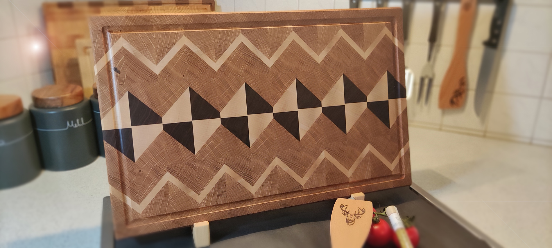 - Einzigartiges Diamond-Muster: Das symmetrische Diamond-Muster verleiht diesem Schneidebrett eine ästhetische Anziehungskraft, die jeden Blick auf sich zieht. Dieses Muster ist nicht nur ein Kunstwerk, sondern auch ein Ausdruck von Handwerkskunst und Liebe zum Detail.