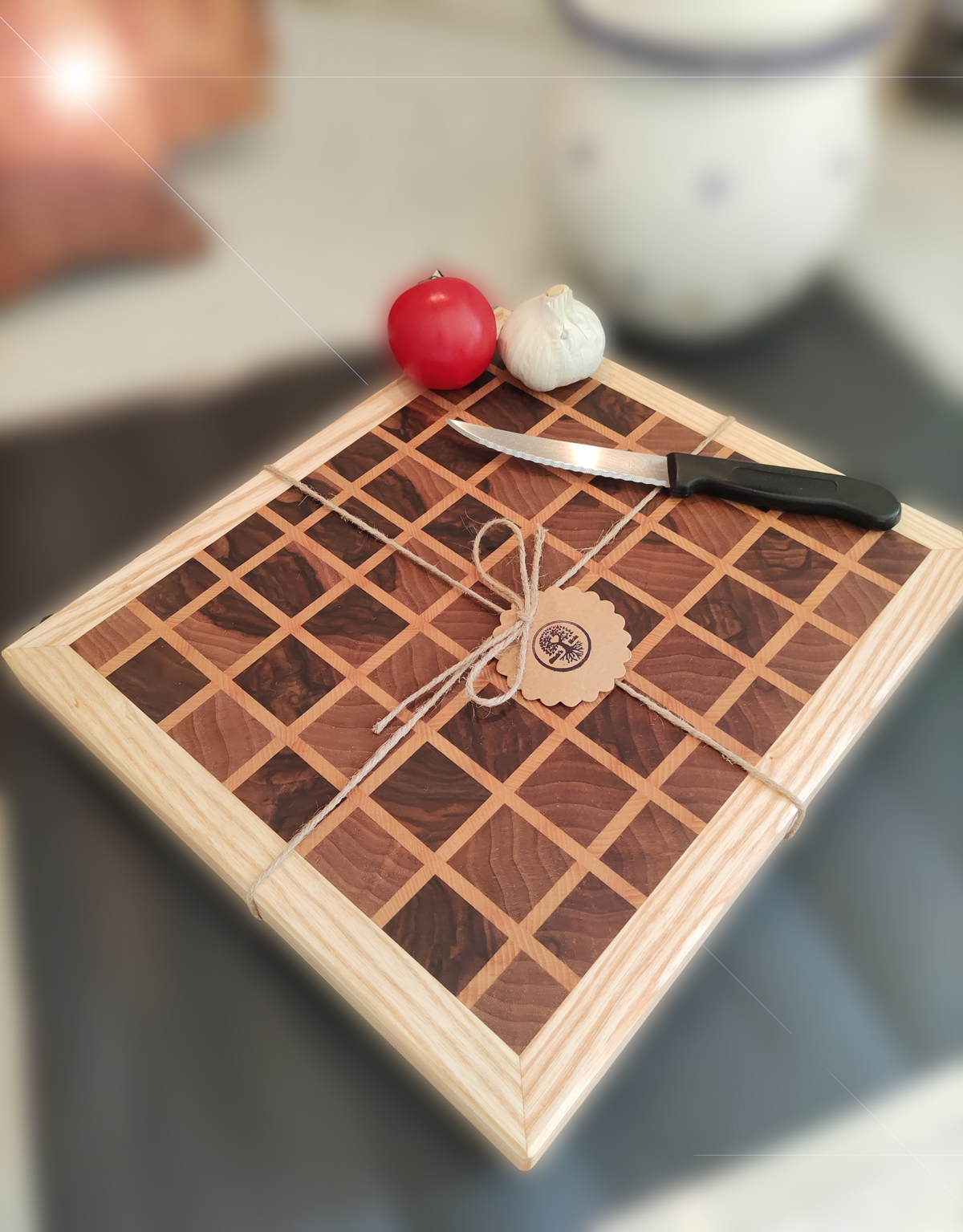 Tauche ein in die Welt von exklusiver Handwerkskunst mit unserem Stirnholz Schneidebrett aus Nussbaum und Esche. Ein wahres Meisterwerk der Natur, das nicht nur deine Küchenarbeiten erleichtert, sondern auch zum Blickfang in jeder Küche wird.